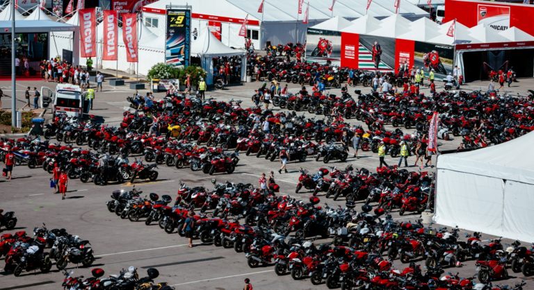 moto a perdita d’occhio, un fiume rosso di Monster, Multistrada, Scrambler e Hypermotard, originali o customizzate, che proprio come l’acqua va a riempire ogni piccolo spazio disponibile. E con i motardi… tutti e dico tutti rigorosamente senza casco!