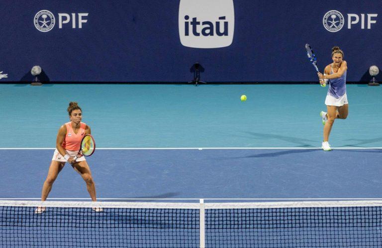 Break per le azzurre in avvio di seconda frazione, con Andreeva alla battuta che non concretizza un vantaggio di 40-0. Contro-break a zero siglato dalla risposta di diritto lungolinea di Shnaider che strappa la battuta a Paolini (1-1). Con un parziale di otto punti a zero le russe tornano avanti (2-1), poi salgono velocemente sul 4-1. Jasmine torna a muovere il punteggio tenendo a zero il suo turno di battuta (4-2). Le azzurre però non mollano e mettono a segno il contro-break sul servizio di Shnaider con Sara che vince proprio contro Diana la battaglia di diritti incrociati. Nell’ottavo game una risposta di rovescio tirata forte e al centro sorprende Errani che cede di nuovo la battuta (5-3). Le azzurre hanno due palle break che non sfruttano, il “deciding point” è sia palla-break Italia che match-point Russia, ma qui la Shnaider caccia in rete una volée non impossibile (5-4). A questo punto sale in cattedra Sara Errani con una copertura straordinaria della rete, proprio con una volée vincente della massese la rimonta è completa (5-5). Shnaider ritrova la prima di servizio, recupera da 15-40 e la coppia russa torna avanti (6-5) ma Errani trascina il set al tie-break (6-6). Le azzurre scattano avanti 6-0, sfruttando al meglio un evidente passaggio a vuoto delle russe, e poi chiudono per 7-2 pareggiando il conto. Si va al match tie-break. Un mini-break per parte poi arriva il primo allungo, che è azzurro (5-3), ma le russe non mollano, recuperano e sorpassano (6-5). Controsorpasso di Sara e Jas sulla risposta in rete di Mirra (7-6). Con uno scambio massacrante a suon di diritti chiuso da Shnaider e poi con una prima robusta di nuovo avanti le russe (8-7). Il diritto di Paolini è fuori ed arrivano altri due match-point per le russe (9-7). Jasmine si riscatta annullando il primo proprio con il diritto (9-8) mentre il secondo (terzo complessivo) è un regalo di Shnaider che mette lunga la volèe di rovescio. Non sbaglia al volo invece Sara ed arriva il primo match-point per le azzurre, ed è ancora Errani a chiuderla con la volée basa di rovescio che non si prende (11-9). Domani Errani e Paolini – alla loro nona finale di coppia (5 i trofei già messi in bacheca), la prima in stagione – si giocheranno il titolo contro la formazione composta dalla cinese Xinyu Juang e dalla taipanese Fang-Hsien Wu.